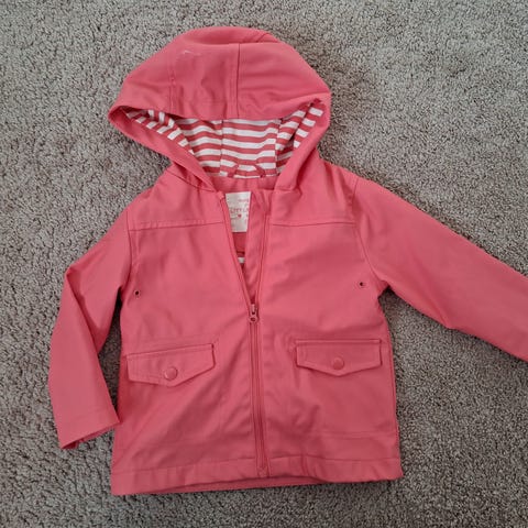 Sadetakki hyvässä kunnossa. Alin tarranauha lähtenyt rispaantumaan, voisi korjata. Kauluksessa ja hupussa vuori eli pitää lämpimänä vähän kylmemmälläkin säällä, muuten vuoritonta mutta melko paksua polyuretaanipinnoitettua trikoota. Irrotettava huppu.