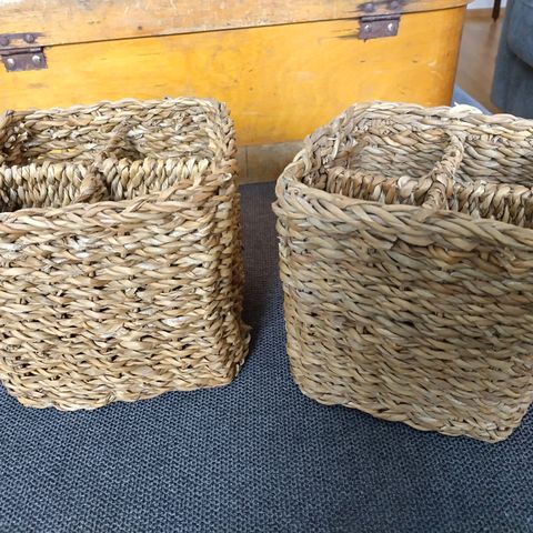 Pyöreän muotoinen säilytyskori / istutuskori on valmistettu luonnonmateriaalista. Siinä on kahvat ja sisäpuolella muovitus.