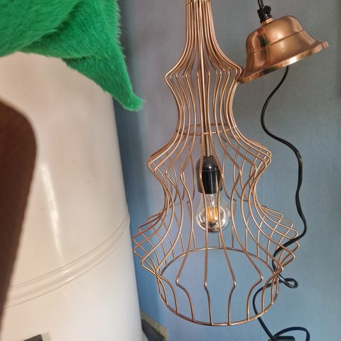 Teollisuus henkinen pieni kattolamppu.Jokainen kpl uniikki ja vähän erilainen.Metallia.Halkaisija 14 cm ja johdon pituus 180 cm.Saa vaikka yövaloksi sängynpäälle.