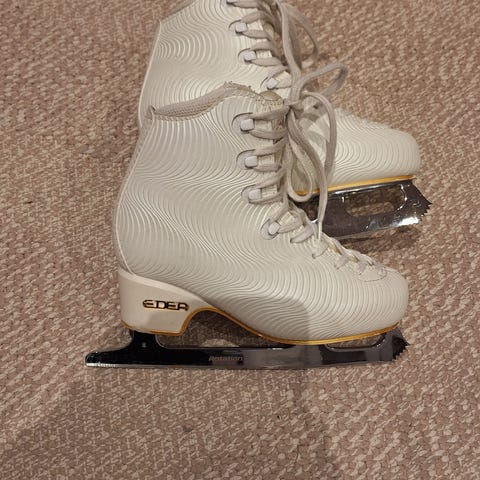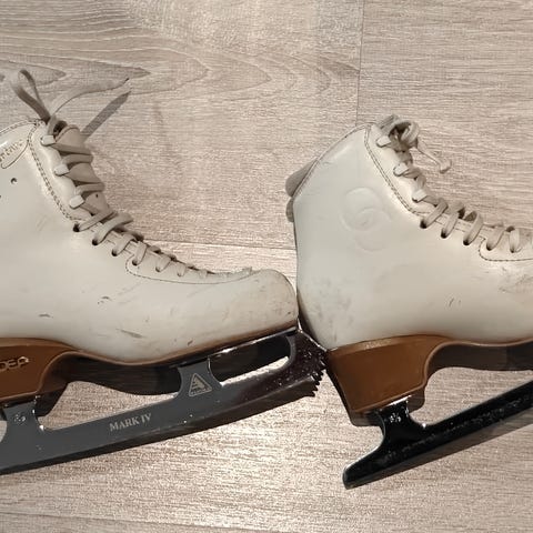 Kengissä paljon käytön jälkiä (katso kuvat) mutta edelleen tukevat. Maalaamalla saa varmasti siistimmäksi. Teroittajan mukaan terässä noin kaksi teroituskertaa jäljellä. Luisteltu vain hallissa.