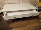 Siisti vain vähän aikaa käytössä ollut sohvapöytä, ostettu v. 2022, taisi olla Maskusta. Jäi tarpeettomaksi kun halusin vaihtaa pyöreään pöytään. Ollut lämpimässä varastossa säilytyksessä sisätiloissa. Puhtaanvalkoinen. Muutama kirkas liimapisara reunassa päälilevyssä. Ei näy jos ei kiinnitä huomiota.
