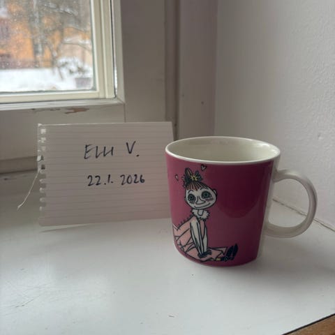 Arabia Muumi muki, valmistettu posliinista, väriltään pinkki. Mukissa on ihastunut prinsessa.