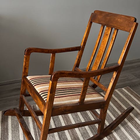 Perinteinen keinutuoli, valmistettu puusta. Tuolissa on korkea selkänoja ja käsinojat. Väri ruskea, käytetty kunto, näkyvissä kulumaa ja ikää osoittavia merkkejä. Sopii kodin tai mökin sisustukseen ja rentoutumiseen. Keinu on pieni ja siro, kuin tehty vanhemmalle naisihmiselle.