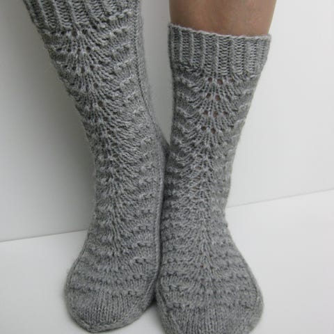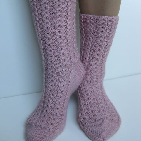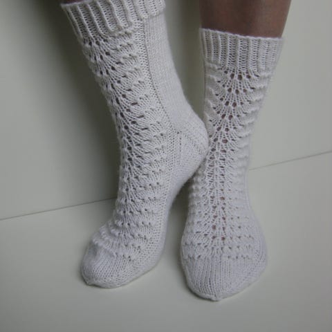 Sukkien etuosassa pitsikuvio, muuten suoraa neuletta.