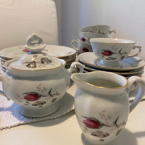 Sisältää kuusi kuppia, kannun ja tarjottimen.