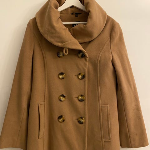 Kuvanmukainen villasekoitetakki, puolipitkä, A-malli, vuorillinen, vain vähän pidetty joten siisti ja hyväkuntoinen, kaunis väri, mustat napit, taskut on