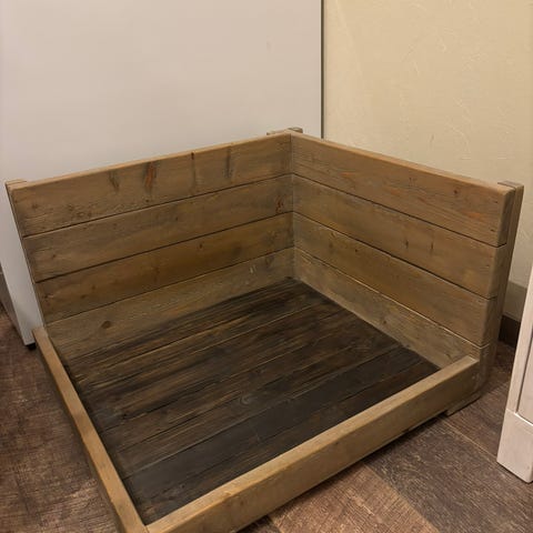 Puusepän tekemä koiran sänky. Valkokuulto maalattu puinen sänky. Musta patja on pestävä.