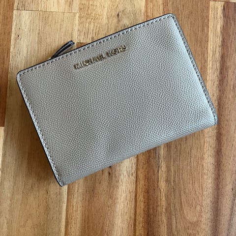 Musta nahkalompakko, koko n. 20 x 10 cm. Sisällä vetoketjullinen pussukka kolikoille sekä molemmin puolin tilaa korteille ja seteleille/kuiteille. Mukana aitoustodistukset.