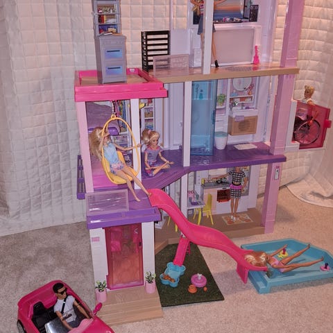 Upea käytetty Barbie-talo. Lattiassa pieni painauma, näkyy kuvassa 3. Talon seinät ja lattia kovaa pahvia. Myydään huonekalujen kanssa (sohva, keittiön kalusteet, sänky, matto kaappi ja hylly)