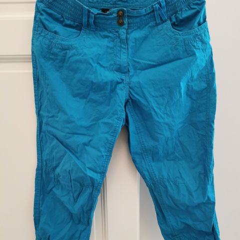 Viskoosi/elastiini caprit eli joustavat. Kauniit. Lahkeen sisäpituus 51. Vyötäröllä kuminauha. Venyttämättä Mitta 66 cm, venyttäen jopa 100 cm. Lantion levein kohta 110 cm.