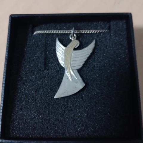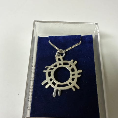 Käsittääkseni se keskikokoinen aurinkoriipus, hopeaa. Ei ketjua.