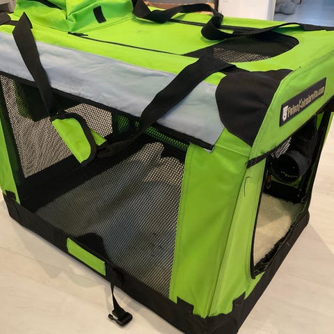 Koko kasattuna: 70 cm pituus, korkeus 50 cm ja leveys 50 cm eli on suhteellisen tilava. Koppa on valmistettu vihreästä ja harmaasta kankaasta ja jossa on sisällä varsin vankka kokoontaittuva alumiinirunko. Koppa on varustettu vetoketjullisilla verkkopaneeleilla ilmanvaihtoa ja näkyvyyttä varten. Helppo kantaa kahvojen avulla. Sopii koiran kuljetukseen ja tilapäiseen käyttöön. Menee helposti kasaan kantokassiin. Vain nouto.