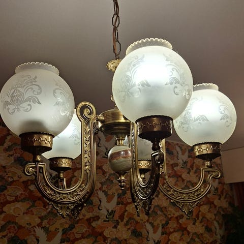 Hyväkuntoinen kattokruunu. Runko keramiikkaa ja oletettavasti messinkiä. Leveys n. 55cm, korkeus kiinnitys rosetista n. 100cm, valaisin runko korkeus n.55cm.