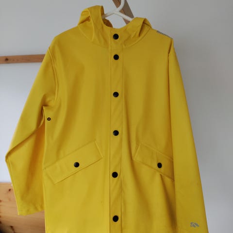 Pehmeän keltainen sadetakki-kuvissa näyttää kirkkaan keltaiselle.Cross sportswear. Made in China. Kolme tahraa on ja kuvattuna, kaksi niskassa ja kolmas edessä vasemmalla rintamuksessa-muuten siisti.