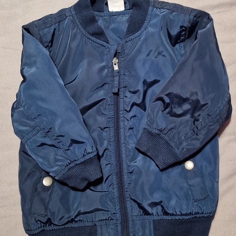 Kevyt välikausitakki kokoa 74, sopii kevääseen ja viileämpään kesäsäähän. Takissa on reilut hihat, joten se mahtui meillä vielä yli 80-senttisenäkin. Toisessa hihassa pieniä tahroja (ks. kuva 4), joita en ole kokeillut poistaa.