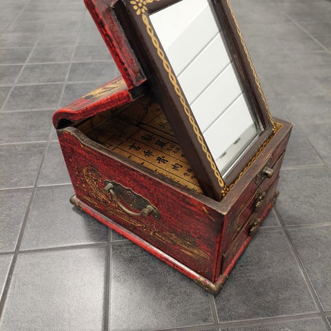 Hyväkuntoinen silkkikangas päällysteinen korurasia peilillä. 18*10cm. Aikakautta vaikea arvioida. Tän olisia on useampia eri väreissä.