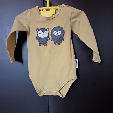 Papu ruskea unisex vauvan body, koko 86/ 92. Valmistettu pehmeästä materiaalista ja varustettu pitkillä hihoilla. Bodyssa on kahdet painonapit haaroissa, joten se sopii useammassa koossa. Lemppari on jo enemmän käytetty mikä näkyy haalistumisena, muuten kunto hyvä käytetty.