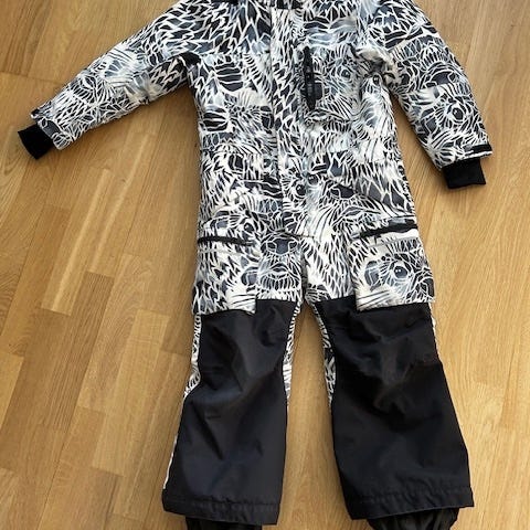 Reima lasten haalari, koko 116 cm,. Haalarissa on väriltään kirjava yläosa ja mustat housunlahkeet. Materiaali on tarkoitettu ulkoiluun ja suojaa sääolosuhteilta neljä pisaraa.