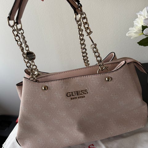 Kaunis vaaleanpunainen Guess Gillian High Society Satchel-laukku, jossa useita taskuja. Tästä pieni tilaihme laukuksi. Vähäisiä käytönjälkiä havaittavissa tarkemmalla tutkailulla. Näistä kuvat. Kuitti löytyy, ovh.145e.