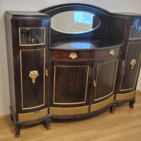 -Kolme kaappia, joista keskimmäisessä neljä vetolaatikkoa ja sivukaapeissa kaksi hyllyä, jotka ovat myös poistettavissa tarvittaessa