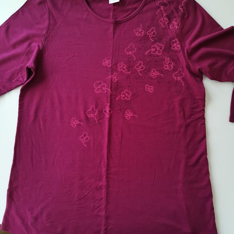 Tum. puna/valkoiset kuviot, pehmeä, joustava kangas. Koko sopii 40 kokoiselle. Puuvilla/modaali. Napit helmaan saakka. Sivutaskut.
