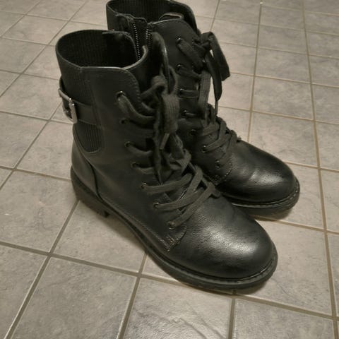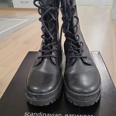 Mustat, makeat, uudenveroiset, muodikkaat ja näyttävät kiilapohjaiset nilkkurit. Tukeva malli, silti kevyet, joten hyvä astella. Pitävä uurrekuvioinen pohja, joka kantapään kohdalla 5 cm. Siisti ohut vuori, päällys tekonahkaa. Edessä somisteena teräksenvärinen vetoketju, joka toimii ja auttaa kengän pukemista. Koko 38.