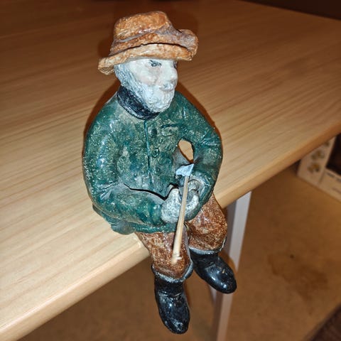 Metallinen koriste-esine, joka esittää kalastajaa veneessä. Materiaali metalli, väriltään hopeanharmaa. Sisältää yksityiskohtaisen kalastajan hahmon, kalastusvavan ja veneen. Sopii sisustukseen tai lahjaksi kalastuksesta kiinnostuneille.