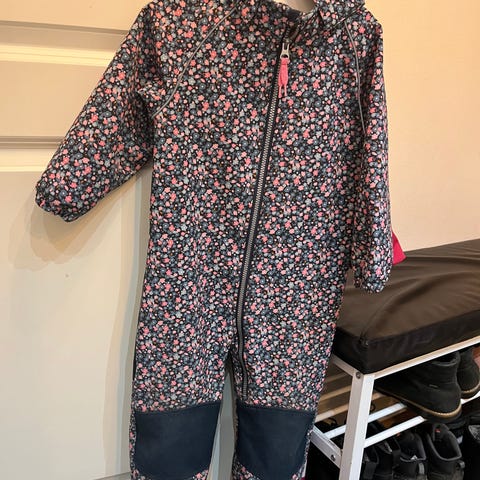 Tummansininen Lassie vk-haalari/softshell haalari, jossa valkoisella kaupunkimaista kuviota. Ehjä, mutta polvista hieman pehmentynyt, mutta polvien kohdalla kaksinkertainen kangas.