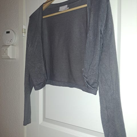 Neulebolero, joka kuultaa vähän läpi. Narut alareunassa kiinnitystä varten. Pienet hihat.