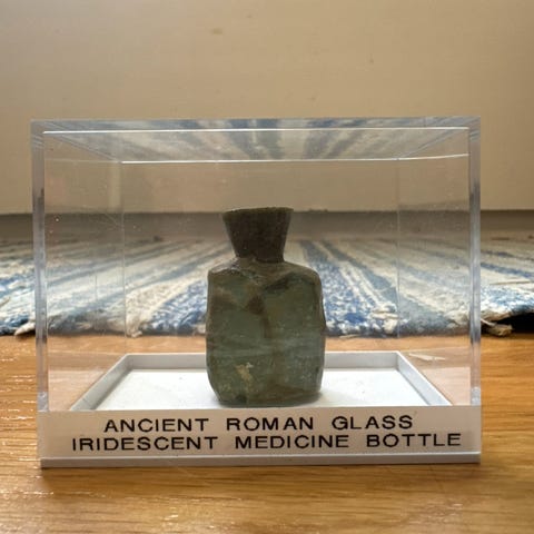 Harvinainen iso lääkepullo, jossa myös lääkelasi korkin päällä.