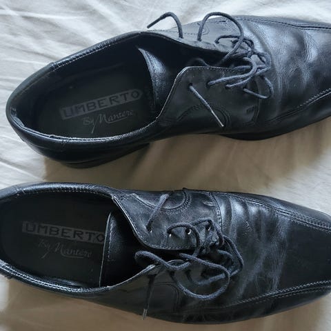 Suloiset nahkaiset juhlakengät. Merkki Walkmates, ja niiden koko on 6. Pehmeää nahkaa. Kärjestä väri kulunut, varmaan voisi saada värjättyä punaisella kenkäplankilla.