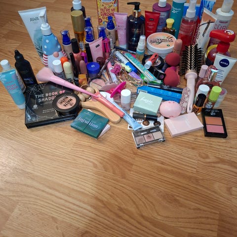 Vasemmalla olevat tuotteet ovat uusia ja täysin käyttämättömiä:Keltainen peitevoide, pieni rasia, 2 sientä, tuubi, 6 sivellintä