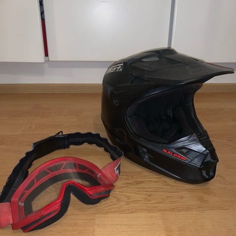 Fox Racing V3 motocrosskypärä, jossa on sininen, keltainen ja punainen väritys. Kypärä on suunniteltu tarjoamaan suojaa moottoripyöräilyyn ja off-road-ajoon. Siinä on kestävä rakenne ja aerodynaaminen muotoilu.Ei kaaduttu tai kolhittu.