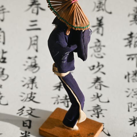Perinteinen japanilainen uuden vuoden koriste, kaksi nukkea ja männynoksa akryylisessä rasiassa. Hyvä vintagekunto. Kork. n. 6cm.