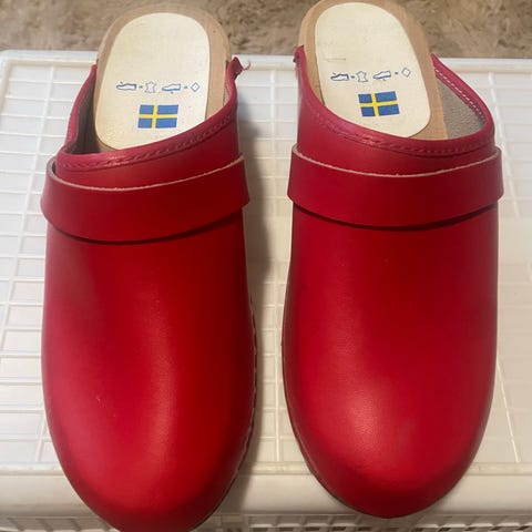 Hanna Sarin puukengät ja pistokkaat, koko 39. Kengissä on puukenkäpohja ja kultainen nahkainen päällinen. Sopivat käytettäväksi naisille. Kengät ovat avomalliset ja niissä on metalliset koristeet sivuilla.