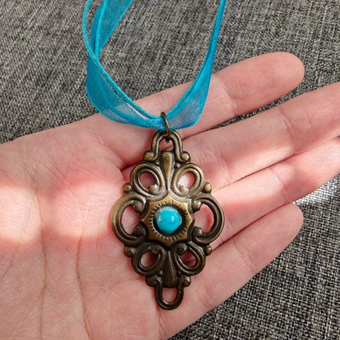 Kaunis värikäs riipus turkoosilla nauhalla.