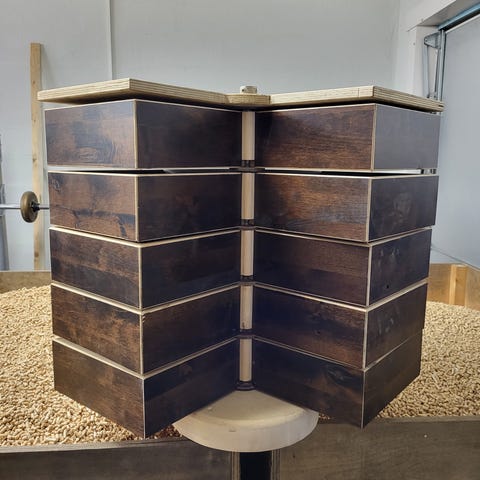 Laatikosto, alun pitäen konttori tarvikkeina, sen jälkeen lämpimässä hallissa. Yksi pääty irti laatikosta, saa kiinni lie jos haluaa. Jonkun isomman merkin tekeleet.