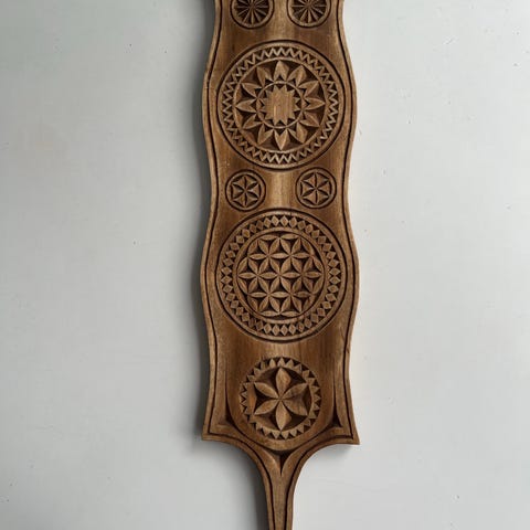 Rukinlapa, puinen seinäkoriste, pituus 30 ½ cm, leveyden levein kohta 9 cm, paksuus 8 mm, hinta 4 euroa.