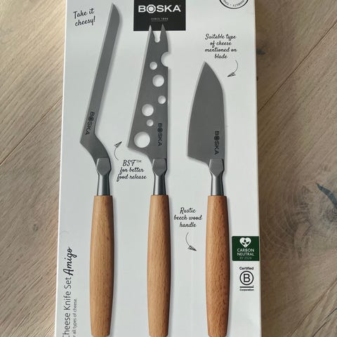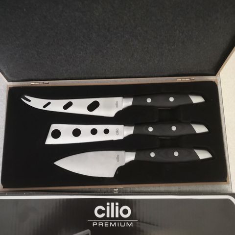Vain pari kertaa käytössä olleet laadukkaat Cilio-juustoveitset kätevässä kotelossa. Veitsien kahvoissa on puuta.
