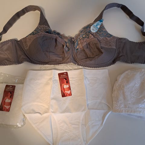Käyttämättömät rintaliivit, valkoisissa koko 85C. Beiget XL.
