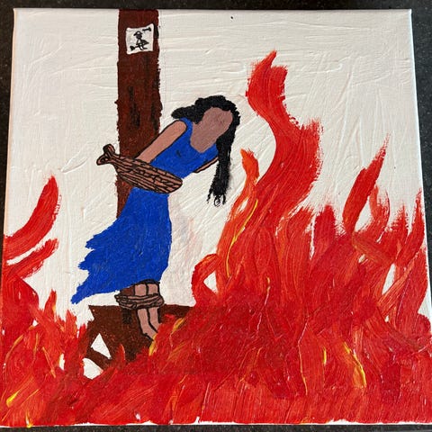 Taide maalaus, jossa on hahmo, lintu ja erilaisia elementtejä violetilla taustavärillä. Maalaus sisältää hahmon, joka on kuvattu yksityiskohtaisesti, sekä linnun ja muita koristeellisia yksityiskohtia.