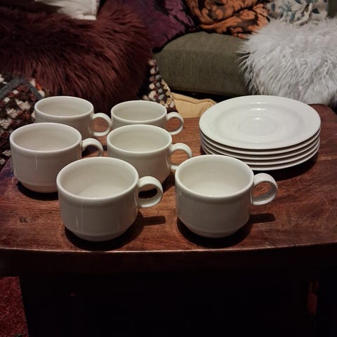 11 kpl aluslautasta + 1 kpl, jonka reunassa lohkeamaa