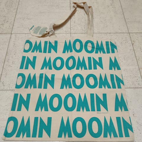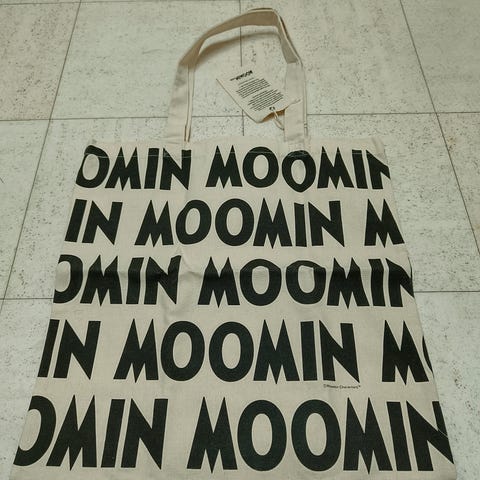 Muumi aiheinen kangaskassi, valkoinen, 30cm x 37cm.