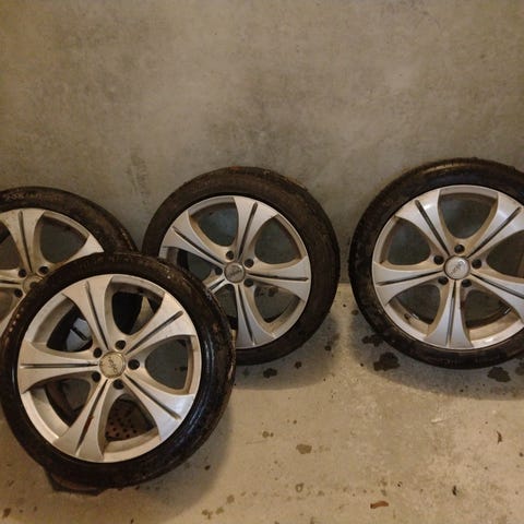 Vanteet juuri pesty ja vahattu. Ostin itselle talvivanteiksi, mutta myinkin auton, johon nämä olivat menossa, joten joutavat seuraavalle. Päällä olevat kesärenkaat ei kummoiset, mutta ei sakkorenkaatkaan. Yhden vanteen reunassa pieni jälki (näkyy kuvassa.