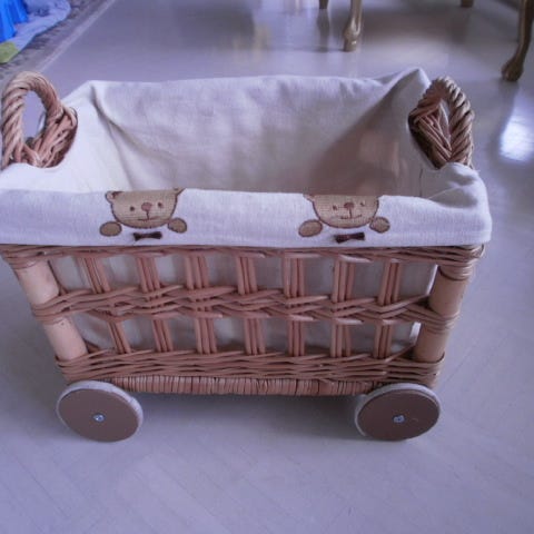 Rottinkinen tummanruskea lelukori pyörillä. Pyörissä maali osittain lähtenyt.
