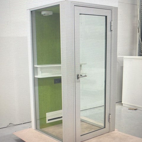Ilmanvaihto, pistorasia / USB, pöytätaso. Sisä- ja ulkoseinät ääntä heijastamatonta akustista paneelia. Oikein siistikuntoinen!