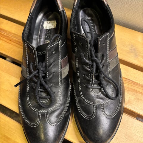 ECCO kävelykengät, koko 38. Ruskeat nahkakengät, joissa vaaleansiniset nauhat. Jämäkkä pohja, reilu koko: itselläni normaalisti 39:n ulkokenkä mutta nämä mahtuvat hyvin jalkaan. Hyvä kunto.