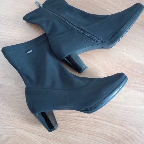 Mustat Aran laadukkaat mokkanahkaiset nilkkurit. Erittäin pehmeä, irrotettava High Soft -pohjallinen tekee kengistä mukavat jalassa, kumipohja, vedenpitävä GoreTex kalvo, koko 4,5=37,5, korko 5 cm.
