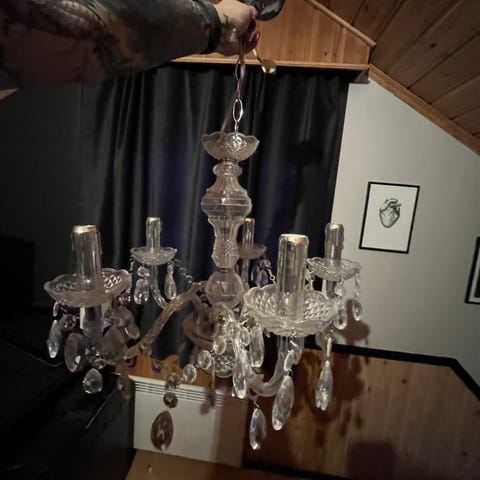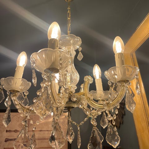 Kristallipisaroita kukalla ja keskustahelmellä, sekä iso pallo kukalla. Purettu Maria Theresia-tyyppisestä kristallikruunusta, kaikki ehjiä. Mitat kuvissa. Pisarat 2€/kpl, päätypallo 5€.