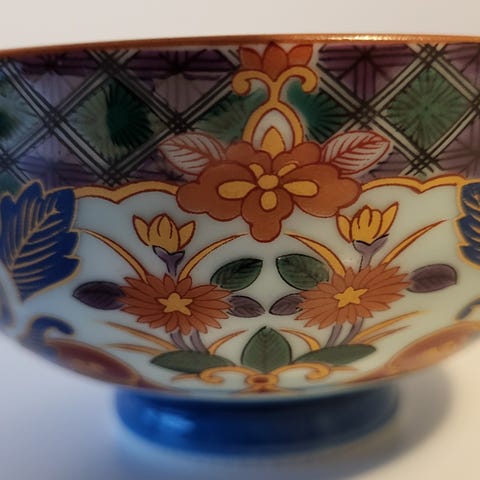 Setti sisältää seitsemän koristeellista posliinista lautasta, joissa on monivärinen Japanilaisaiheinen käsin maalattu kuvitus. Lautaset ovat pyöreitä ja niiden reunat ovat punertavat. Lautasten koko on keskikokoinen, ja ne soveltuvat koristekäyttöön tai kevyempään tarjoiluun. Halk. 13 cm